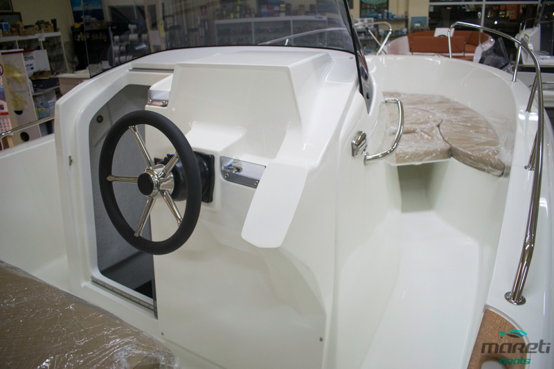 Esta embarcación open es idéntica en distribución de cubierta a la 600 open pero con la gran ventaja de ofrecer 1 metro más en eslora y unos cm más de manga. Su gran consola central con paso por ambos lados y nos ofrece una pequeña cabina en el interior de la misma, en la que podremos guardar cantidad de objetos e incluso instalar una litera opcional o un wc químico.